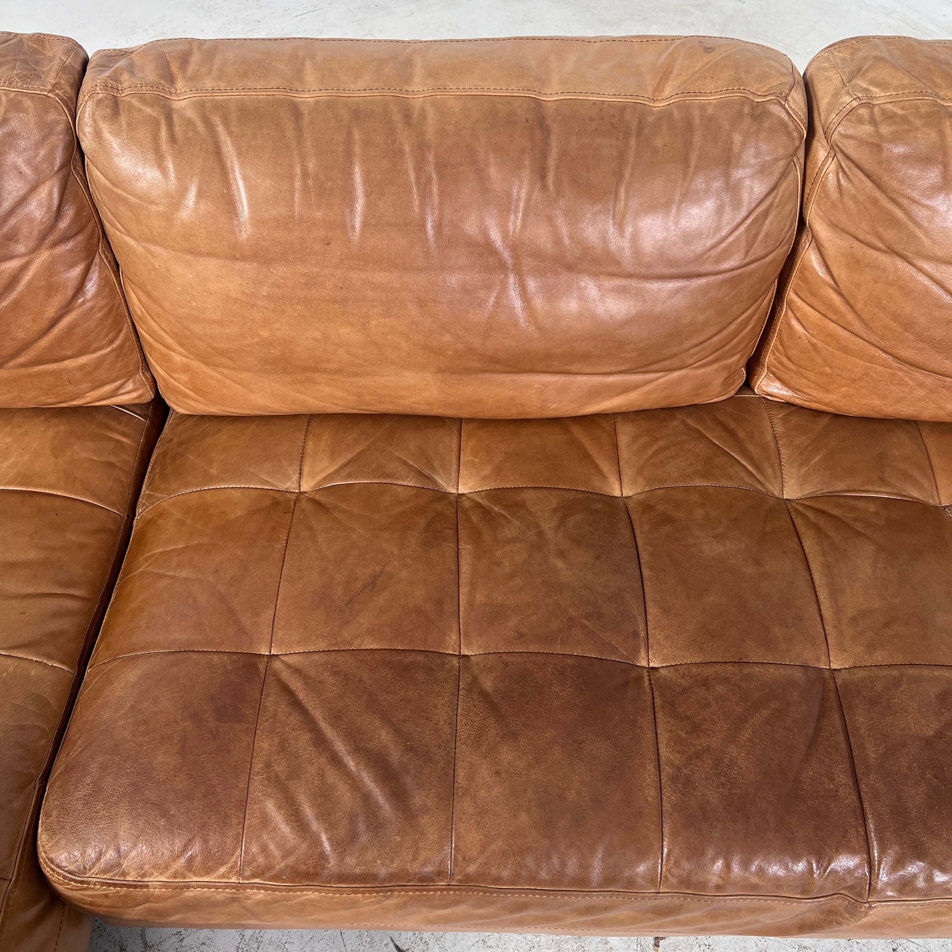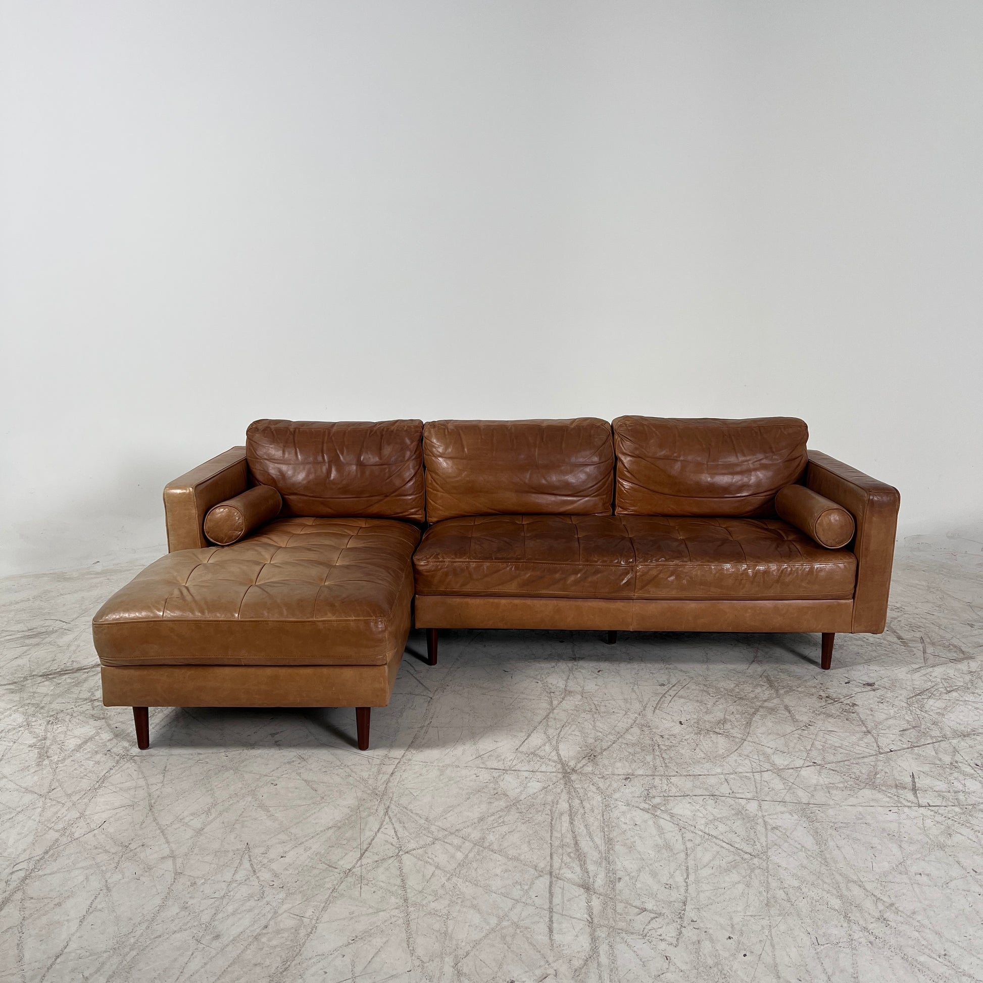 Mid century Cognac leather sectional. L shaped sofa couch.